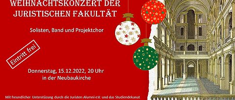 Am Donnerstag, den 15.12.2022, findet um 20 Uhr in der Neubaukirche das Weihnachtskonzert der Juristischen Fakultät statt. Der Eintritt ist frei!