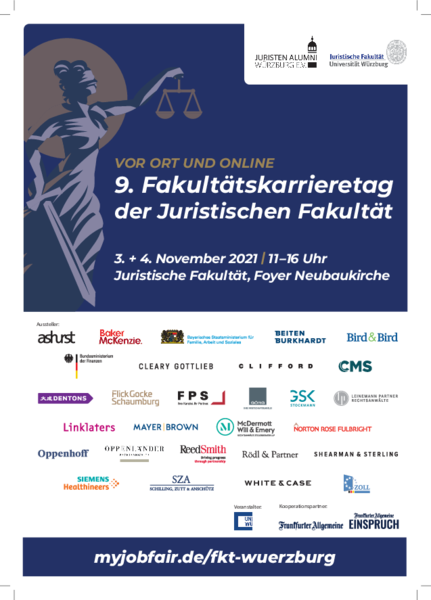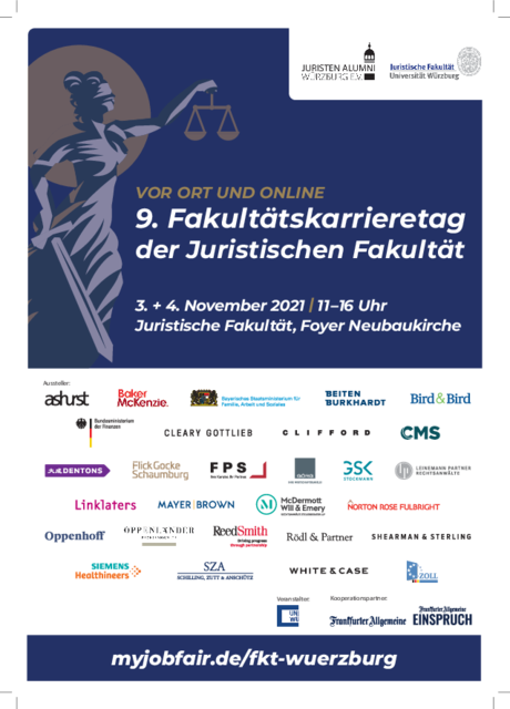 Am 03. und 04. November 2021 findet der 9. Fakultätskarrieretag in der Alten Universität statt. Studierende, Referendare, wissenschaftliche Mitarbeiter und Volljuristen können hier direkte Kontakte zu Personalverantwortlichen verschiedener Unternehmen und Kanzleien knüpfen.