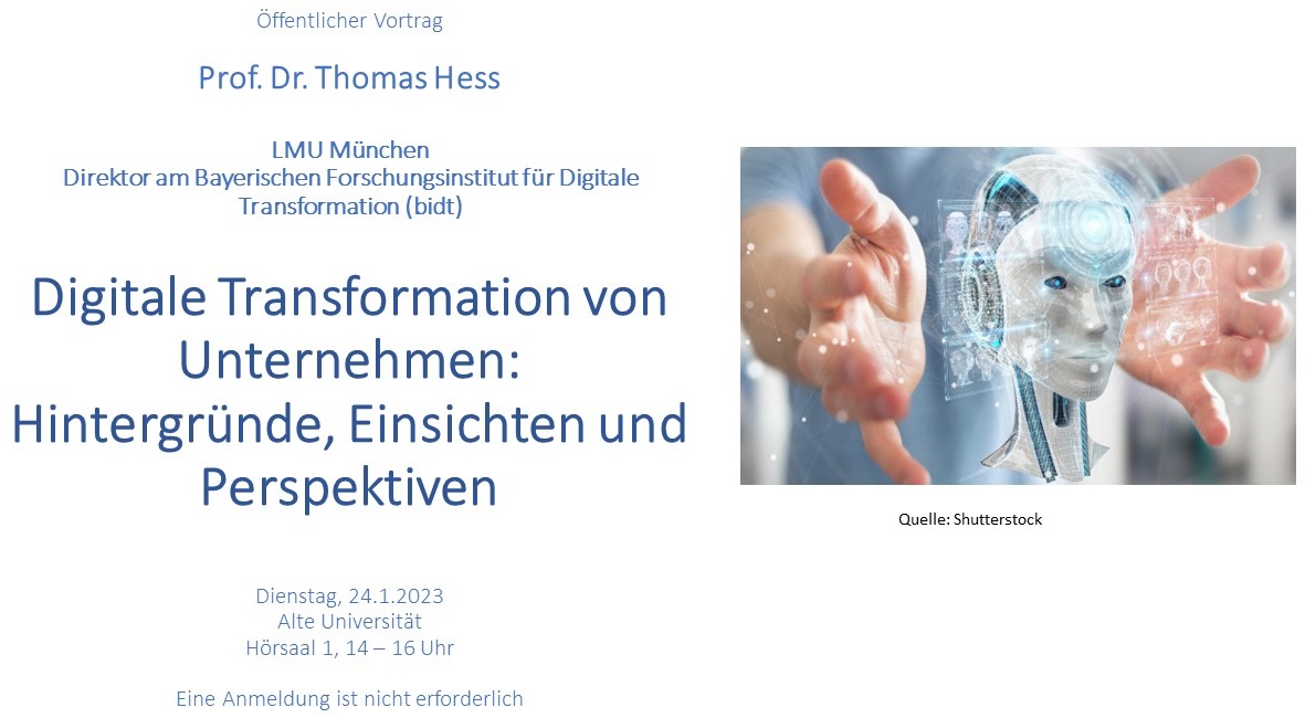 24.01.2023Am 24.01.2023 wird Prof. Dr. Thomas Hess einen Vortrag zum Thema "Digitale Transformation von Unternehmen: Hintergründe, Einsichten und Perspektiven" im Hörsaal I von 14-16 Uhr halten.