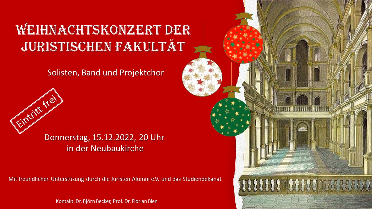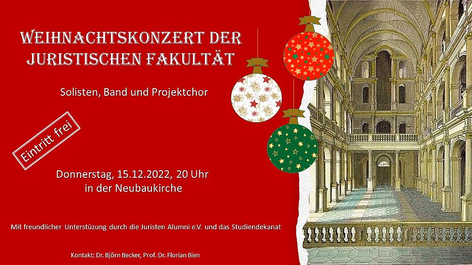 02.12.2022Am Donnerstag, den 15.12.2022, findet um 20 Uhr in der Neubaukirche das Weihnachtskonzert der Juristischen Fakultät statt. Der Eintritt ist frei!