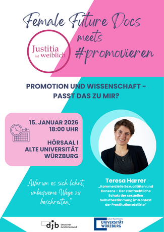 Bei der Veranstaltung „Female Future Docs“ berichten verschiedene Nachwuchswissenschaftler*innen, wie sie den Weg zur Promotion gegangen sind. Welches Thema hat sie begeistert? Welche formalen Voraussetzungen gilt es zu beachten? Welche Hürden gilt es zu überwinden? Bei der Veranstaltung am 15.01.2026 spricht Teresa Harrer, die an der Universität Leipzig promoviert, an der Fernuni Hagen als wissenschaftliche Mitarbeiterin tätig und zudem Stipendiatin des djb ist, über ihr spannendes Promotionsthema „Kommerzielle Sexualitäten und Konsens – Der strafrechtliche Schutz der sexuellen Selbstbestimmung im Kontext der Prostitutionsdelikte“ sowie über ihre Erfahrungen beim Schreiben, Netzwerken, Forschen und Promovieren generell. Teresa Harrer wird insbesondere erzählen, wie ihre berufliche Entwicklung abseits des „gewöhnlichen“ Weges vonstattenging, wie sie zu ihrem Forschungsprojekt, ihrer Betreuung und zu dem Stipendium kam. Einen Blick wird sie dabei auch auf die Relevanz der interdisziplinären und empirischen Forschung in ihrem Projekt werfen. Ob ihr bereits mit dem konkreten Gedanken spielt, in der Zukunft eine Promotion zu beginnen, oder ihr euch nur grob informieren wollt, wie der Weg dahin aussehen kann: Kommt um 18:00 Uhr vor Ort vorbei oder schaltet euch online in den Livestream! Erfahrt mehr über Teresa Harrers Projekt und ihre Erfahrungen und nutzt die Gelegenheit, eure Fragen zum Promovieren zu stellen.