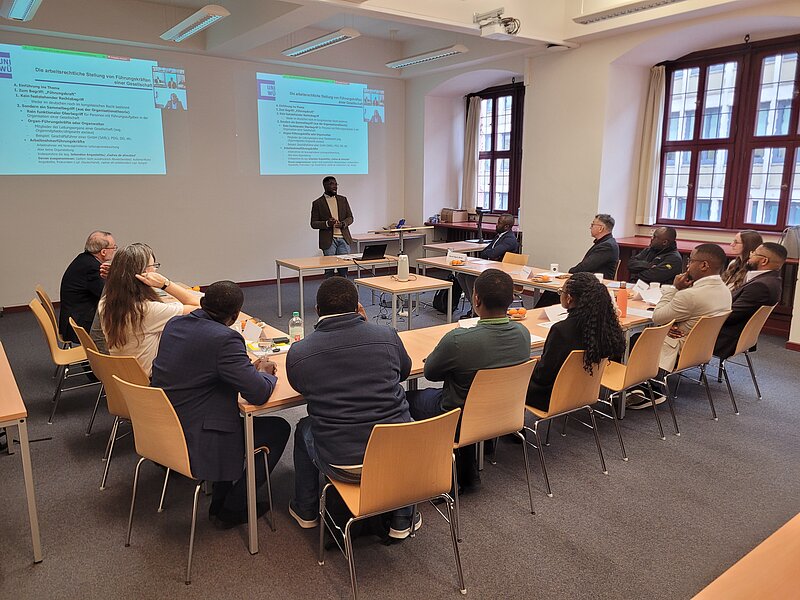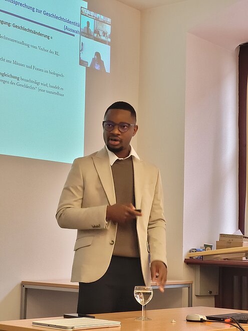 Die Themen des ersten Teil des Forums, der dem Arbeits- und Sozialrecht gewidmet war, behandelten die arbeitsrechtliche Stellung von Führungskräften in einer Gesellschaft in rechtsvergleichender deutsch-kongolesischer Perspektive (Dieu-Merci Ngusu Masuta, Würzburg) sowie den Diskriminierungsschutz transgeschlechtlicher und nicht-binärer Personen im EU-Arbeits- und Sozialrecht (Kenny Iyav, Würzburg).