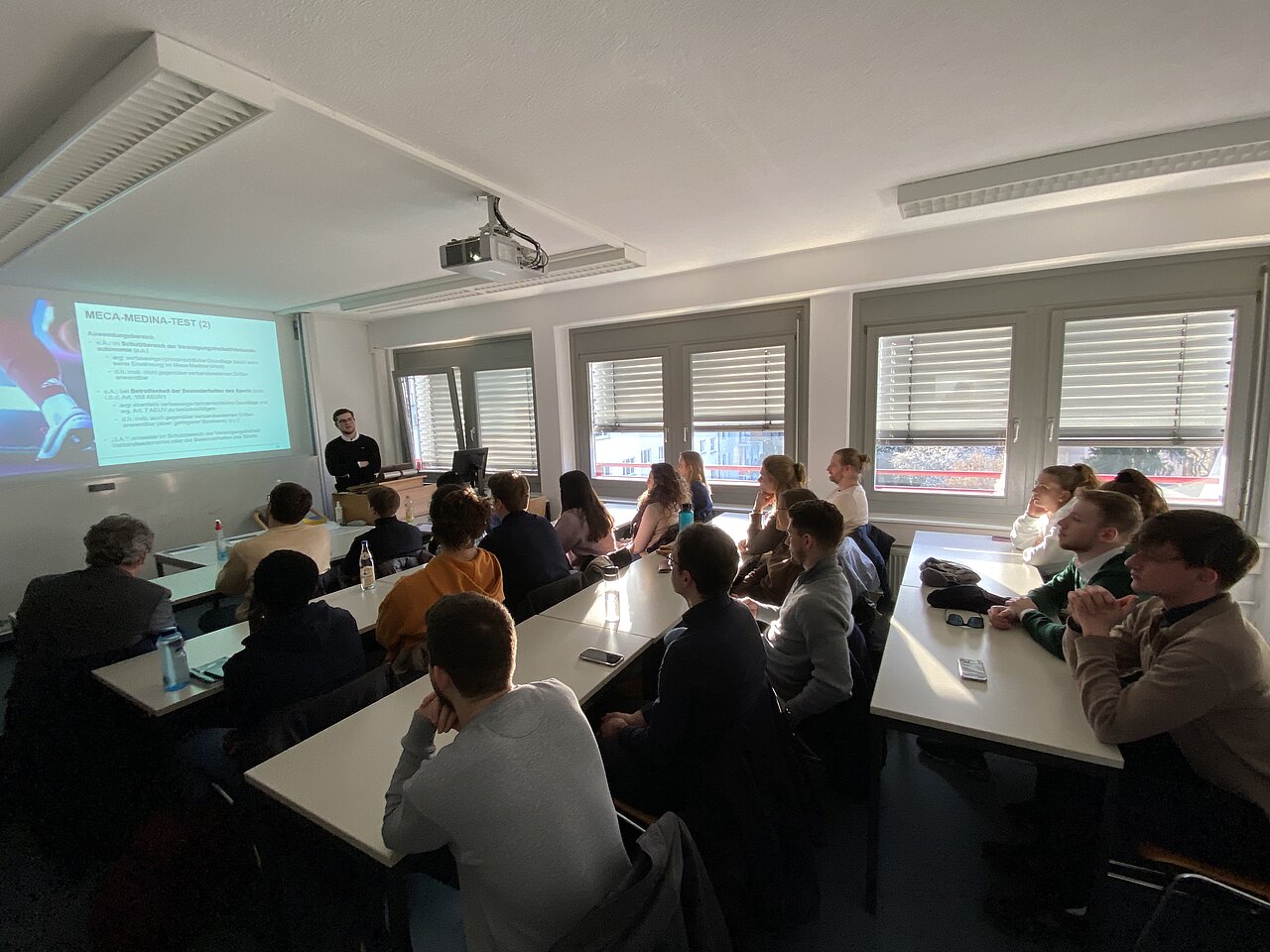 Den Auftakt bildete am Montagnachmittag ein von Dr. Becker organisiertes Kolloquium in den Räumlichkeiten des Karlsruhe Institut for Technology (KIT), die uns der Karlsruher Immaterialgüterrechtler Prof. Thomas Dreier freundlicherweise zur Verfügung stellte. Neben dem Veranstalter hielten der Würzburger Alumnus Dr. Thilo Hahn (Justiziar bei der DFL) und Herr Rechtsanwalt Mark E. Orth einführende Vorträge zum Verhältnis von Sportverbänden und Kartellrecht. Die Teilnehmerinnen und Teilnehmer, überwiegend Studenten im und Interessenten am SPB 8 Wettbewerb und Regulierung, die teilweise auch das von Dr. Becker im SoSe 2023 angebotenen Seminar zum Sportkartellrecht belegen, beteiligten sich lebhaft an den sich anschließenden Diskussionen.